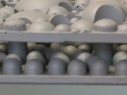 Es handelt sich um eine fehgraue doppellagige Kunststoffplatte mit einer grob strukturierten Oberfläche. Das Probengewicht beträgt 10,6 kg/m2. Die Gesamtdicke des Materials beträgt ca. 4 cm; dabei entfallen 0,4 cm auf die Grundplatte und 2 cm auf die Abstandshalter zwischen Grund- und Deckplatte. Die Deckplatte ist durch eine unstrukturierte Aneinanderreihung von Kugelkalotten mit Radien zwischen 0,2 cm und 1,8 cm geprägt (siehe Abbildung). Ferner ist die Deckplatte von einer großen Zahl von kreisförmigen Löchern durchbrochen. Die Stärke der Deckplatte beträgt ca. 0,5 cm. Die Grundplatte enthält auf der nach vorn gerichteten Fläche eine dichte Struktur von hervorstehenden Säulen.